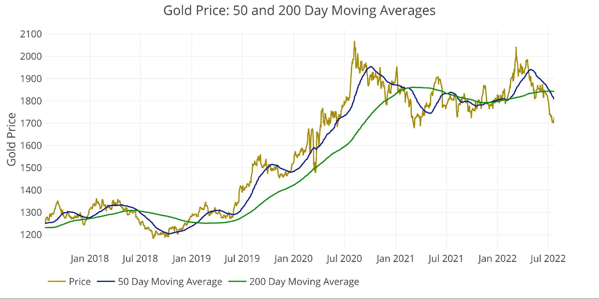 Der 50-tägige gleitende Durchschnitt (1.806 Dollar) durchbrach den 200-tägigen gleitenden Durchschnitt (1.842 Dollar) und bildete damit ein Todeskreuz. Dies ist ein rückläufiger Indikator, zumal der Goldpreis mit 1.727 Dollar deutlich unter beiden Werten liegt.