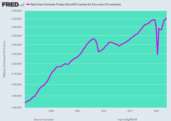 Das Trio aus Sanktionskrieg, grünem Energiekreuzzug und Viruspatrouille ist eine tödliche Bedrohung für den kapitalistischen Wohlstand. Das zeigt sich bereits in der Eurozone, wo diese politischen Krankheiten am weitesten fortgeschritten sind und wo die reale BIP-Wachstumsrate gegenüber der Zeit vor der Krise 2008 um 74% eingebrochen ist. Das ist richtig. Die reale Wachstumsrate in den E19-Ländern betrug in der 14-Jahresspanne zwischen dem ersten Quartal 2008 und dem ersten Quartal 2022 nur 0,67% im Jahr, im Vergleich zu 2,29% im Jahr im entsprechenden Zeitraum zwischen 1995 und 2008.