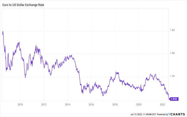 Natürlich sind beide Zinssätze angesichts einer jährlichen Inflationsrate von über 8% völlig irrational, aber auf kurze Sicht ist die derzeitige und künftige Diskrepanz so ungeheuerlich, dass der Wechselkurs des Euro buchstäblich untergeht. Er flirtet jetzt mit der Parität, was bedeutet, dass sein Wechselkurs gegenüber dem Dollar allein im letzten Jahr um 15% und seit dem Höchststand Mitte 2008 um mehr als 58% gesunken ist. Es erübrigt sich zu sagen, dass ein kollabierender Wechselkurs ein klassisches Rezept für einen Anstieg der importierten Inflation ist. Wenn wir schon von "hinter der Kurve" sprechen - die EZB ist so weit hinten, dass sie kaum noch sichtbar ist.