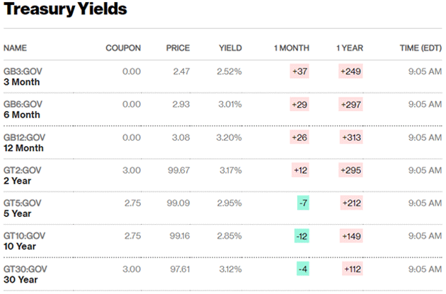 Werfen wir einen Blick auf die aktuelle Renditekurve vom Freitagmorgen (12. August). Die 2-Jahres/10-Jahres-Spanne liegt bei negativen 0,32%. Das ist besser als am vergangenen Freitag, als sie bei minus 0,42% lag.