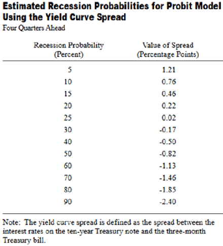 Im Jahr 1996 verfassten die Volkswirtschaftler der New Yorker Fed, Arturo Estrella und Frederic S. Mishkin, ein Papier, in dem sie die Renditekurve mit 19 anderen Indikatoren verglichen und, was besonders wichtig ist, einen Zusammenhang zwischen der Renditespanne und der Rezessionswahrscheinlichkeit fanden.