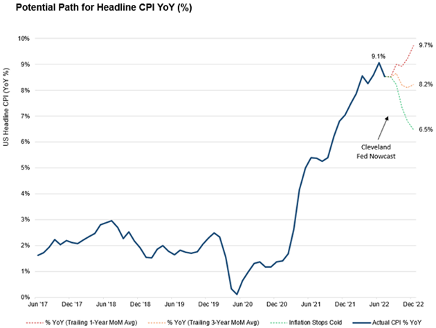 Wohin mit der Inflation?Mein Freund und Duke-Professor Campbell Harvey (derselbe Campbell Harvey, der das oben erwähnte Papier von 1986 geschrieben hat) hat kürzlich in einem kurzen Video-Podcast erklärt, warum er und Rob Arnott von Research Affiliates glauben, dass die Inflation bis zum Jahresende hoch bleiben wird. Selbst wenn man für den Rest des Jahres von einer monatlichen Inflation von 0% ausgeht, wie wir sie gerade im Juli hatten, wird die Inflation auf Jahresbasis immer noch 6,5% betragen. Der Inflations-Nowcast der Cleveland Fed geht grundsätzlich von einer Inflation von 0% aus. Man muss nur von einer leichten Inflation ausgehen, um im Bereich von 8% bis 9% zu bleiben.