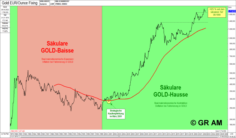 Abb. 5: Goldpreis in EUR/Unze (vor 1999 ECU) auf Monatsschlusskursbasis von 12/1978 bis 08/2022