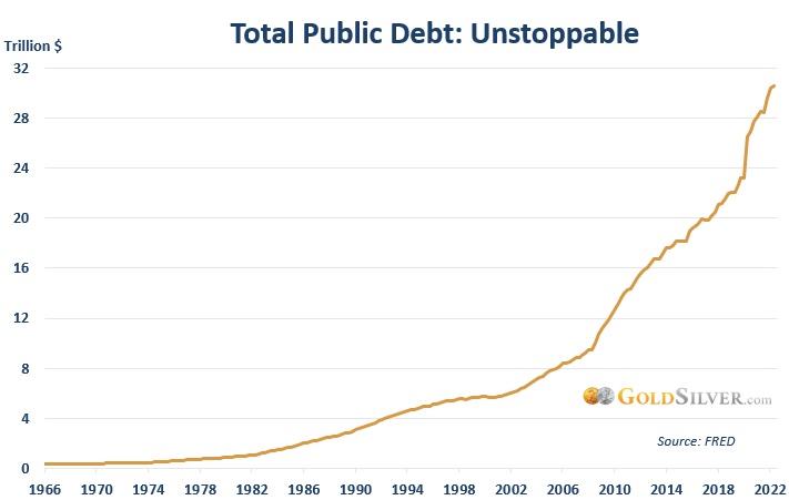 Wie Sie sehen können, ist die Staatsverschuldung seit 2000 unaufhaltsam gestiegen. Es ist nichts weniger als ein parabolischer Anstieg. Allein seit 2008 ist die Gesamtverschuldung des Bundes in den Vereinigten Staaten um satte 224% gestiegen. Das heißt, sie haben sich in 14 Jahren mehr als verdreifacht. Allein seit COVID im März 2020 ist sie um 15,5% gestiegen. Man braucht nicht viel mathematisches Verständnis, um zu verstehen, dass dies nicht nachhaltig ist. Und wenn man nicht davon ausgeht, dass die Defizite in Zukunft gleich Null sein werden - Defizite werden automatisch zu den Schulden hinzugerechnet -, wird diese Zahl nur noch weiter nach oben gehen.