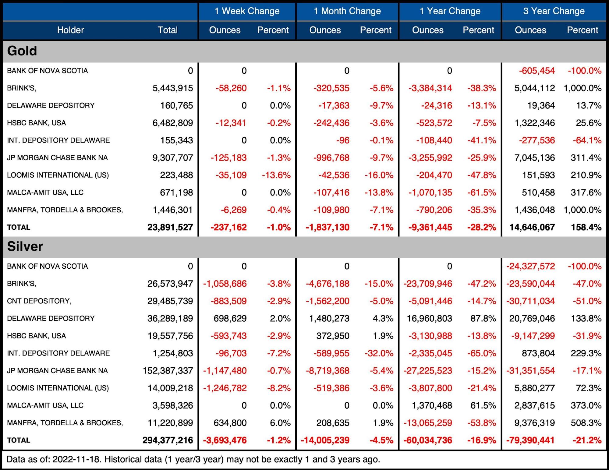 In allen Tresoren sind die Bestände im letzten Monat gesunken, in 6 Tresoren um mehr als 5%. Loomis hat allein in der letzten Woche 13,1% seines Metallbestands verloren. Im letzten Jahr haben 6 Tresore mehr als 25% ihres Gesamtbestandes verloren!