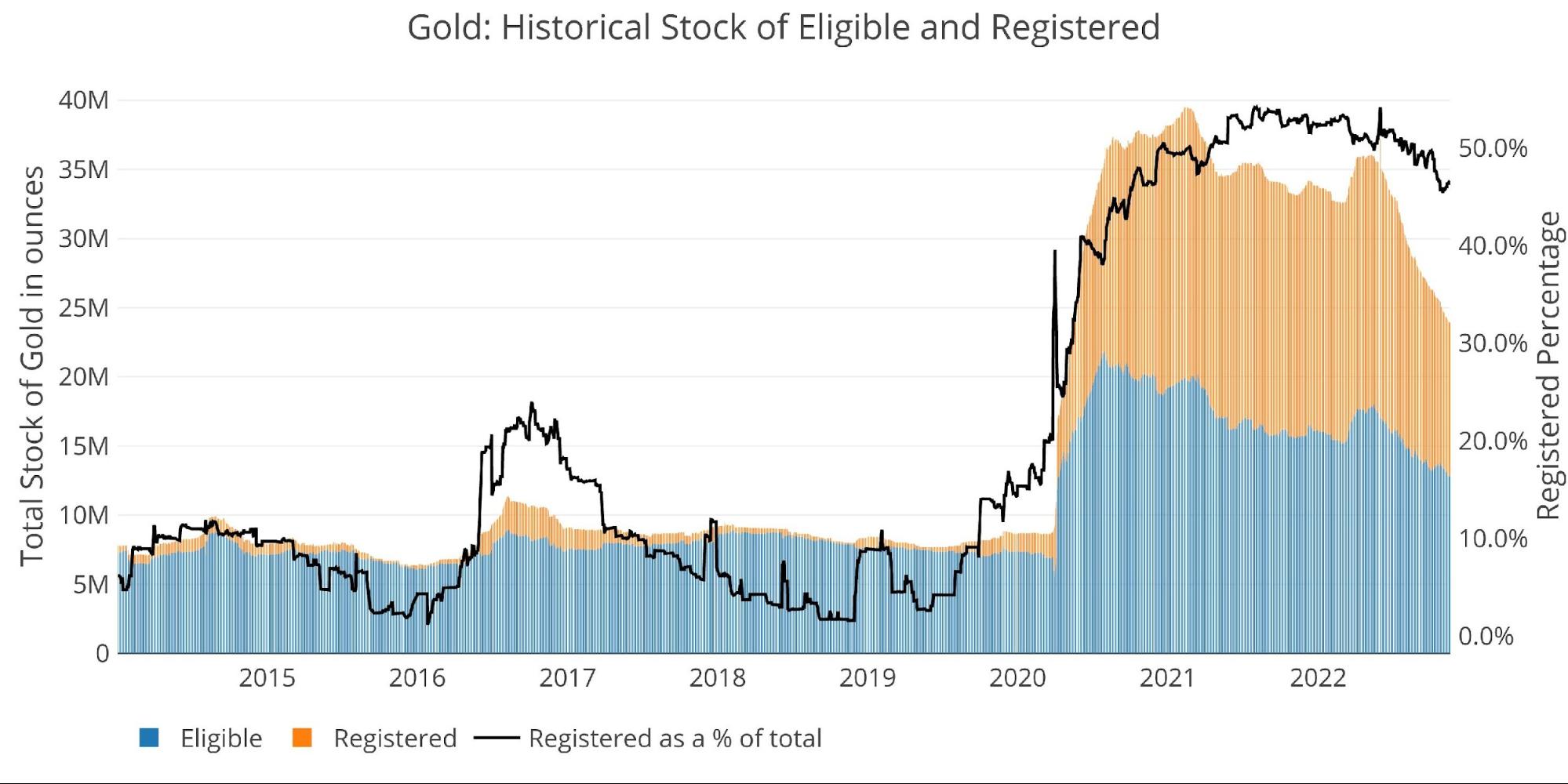 Ein Blick auf die Bestände von Gold und Silber zeigt, wie massiv die derzeitige Bewegung war. Der Rückgang war schnell und steil, wobei sowohl bei den berechtigten als auch bei den registrierten Beständen Verluste zu verzeichnen waren. Der Anteil der registrierten Bestände am Gesamtbestand ist im letzten Monat gesunken, da sich die Abflüsse aus den registrierten Beständen beschleunigt haben.