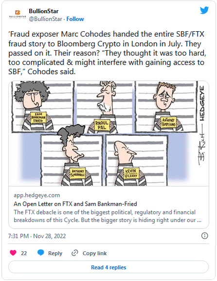 Am 21. November wies die große Website Hedgeye darauf hin, dass Marc Cohodes, der den Betrug aufgedeckt hat, im Juli die gesamte FTX-Betrugsgeschichte an Bloomberg Crypto in London weitergegeben hat, Bloomberg aber nicht darauf reagiert hat. "Bedenken Sie dies. Betrugsaufdecker und Shortseller-Veteran Marc Cohodes übergab im Juli die gesamte SBF/FTX-Betrugsgeschichte an Bloomberg Crypto in London. Sie haben es ignoriert. Lassen Sie das sacken. Ihr Grund? Sie dachten, es sei zu schwierig, zu kompliziert und könnte den Zugang zu SBF in Zukunft erschweren", so Cohodes."