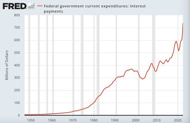 Einfach ausgedrückt: Wie und warum können wir so sicher sein, dass das nächste QE-Programm das bisher größte sein wird? Das ist ganz einfach eine Frage der Mathematik. Als die Zinsen im Jahr 2022 stiegen, stieg der Haushaltsposten "Zinsen auf die Staatsverschuldung" auf fast 750 Milliarden Dollar im Jahr an. Sollten die Zinsen weiter steigen, würde diese eine Ausgabe bald andere "notwendige" Staatsausgaben wie Sozialausgaben und Verteidigung in den Schatten stellen. Dies kann und wird nicht zugelassen werden.