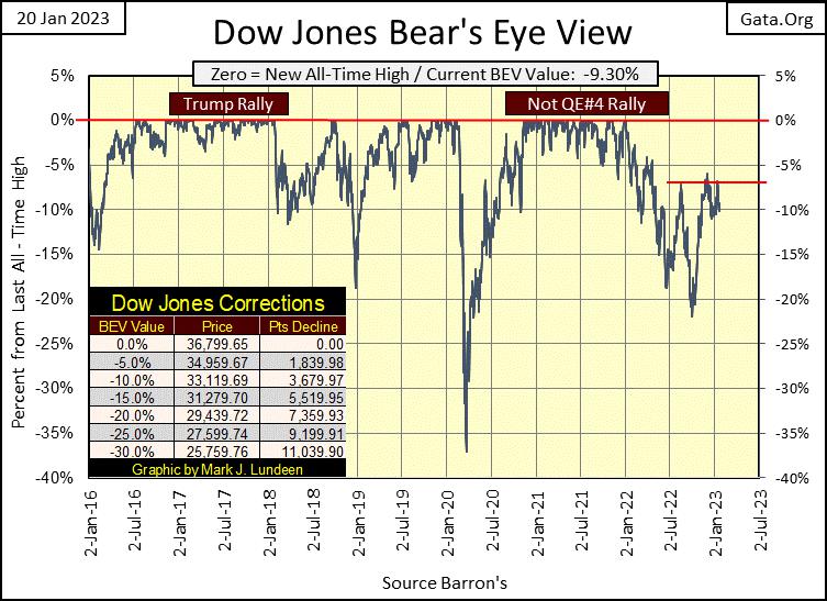Der Dow Jones hat weiterhin Schwierigkeiten, seine BEV -5%-Linie im untenstehenden Bear's Eye View Chart zu durchbrechen. Am Montag der letzten Woche unternahm er den dritten gescheiterten Versuch seit August letzten Jahres, diese Marke zu überschreiten. Die Tatsache, dass der Dow Jones die Woche mit einem BEV von -9,30% und damit knapp über der BEV-10%-Linie schloss, ist meiner Meinung nach ein Hinweis auf eine Erschöpfung des Marktes. Was ist passiert? Zwei Quellen der "Liquidität" für die Bullen trocknen aus: Der FOMC hat seine "Liquidität" aus dem Finanzsystem abgezogen; 410,75 Milliarden Dollar seit Mai,
