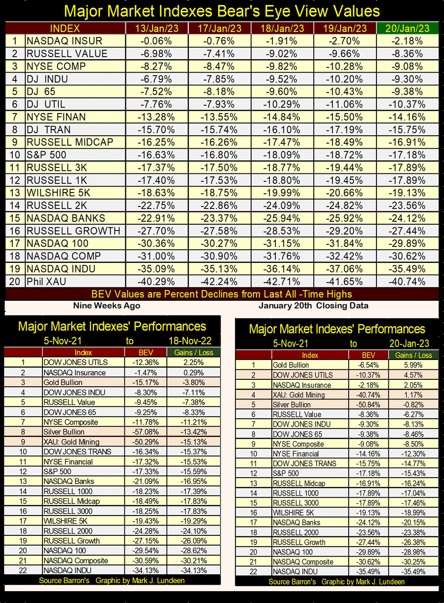 Die beiden oben genannten Marktaxiome sind heute so wahr wie eh und je. Schauen wir uns die Bear-Eye-View-Werte für die wichtigsten Marktindices, die ich verfolge, in der folgenden Tabelle an. Vor langer Zeit, in der ersten Novemberwoche 2021, wies diese Tabelle 66 neue Allzeithochs auf, während alle anderen Indices (mit Ausnahme des XAU) weniger als 5% von einem neuen Allzeithoch entfernt waren. Vierzehn Monate später sieht diese Tabelle wie folgt aus. Die glamourösen Werte des NASDAQ sind um 30% oder mehr gefallen (Platz 17-19).