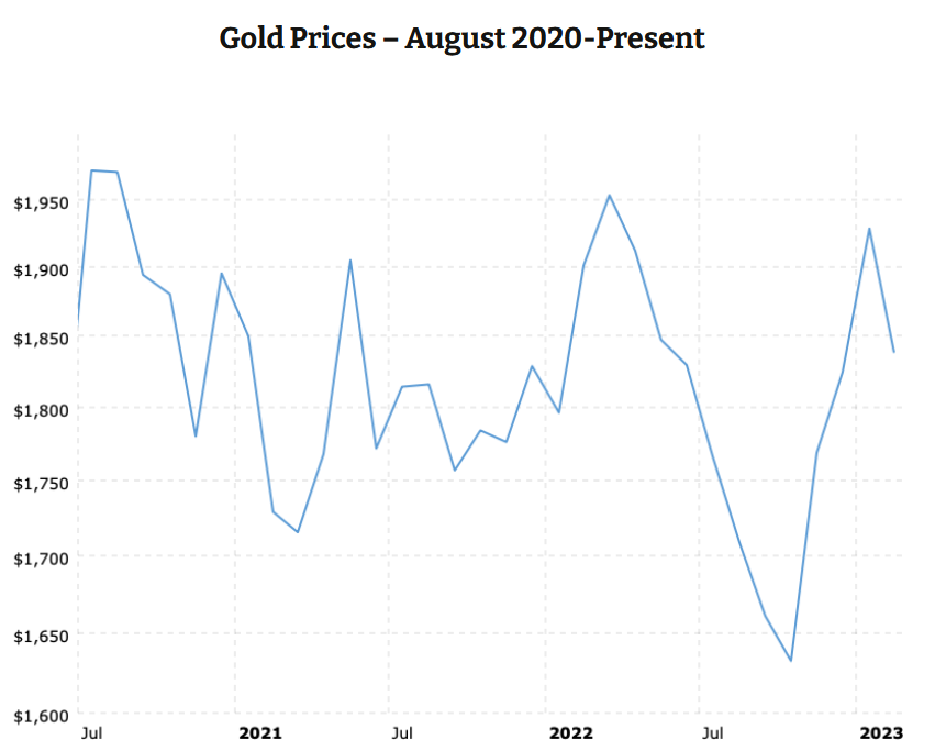 Erinnern Sie sich daran, dass der große Schub, der den Goldpreis von 1.600 Dollar auf den Höchststand von 2.000 Dollar brachte, innerhalb eines kurzen Zeitraums von drei Monaten erfolgte, nachdem die Regierung Privatpersonen und Unternehmen mit einer riesigen Menge an "Gratisgeld" und billigen und leichten Krediten versorgt hatte. Infolgedessen riefen einige nach einem Zusammenbruch des Vertrauens in den US-Dollar und einem daraus resultierenden Goldpreis von 10.000 Dollar oder mehr. Und wo stehen wir jetzt? Nachfolgend ein weiterer Chart, der die Entwicklung des Goldpreises seit dem Sommer 2020 zeigt...