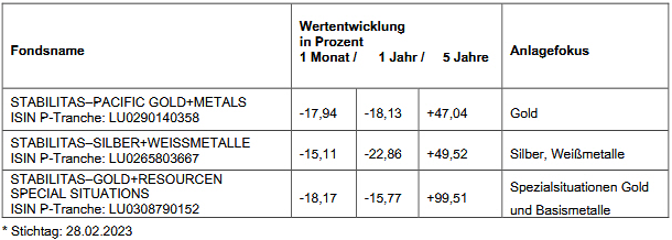 Die Investmentboutique Stabilitas GmbH hat sich auf die Beratung von Edelmetallinvestments spezialisiert. Seit Unternehmensgründung im Jahr 2006 berät das Unternehmen die auf den Minensektor ausgerichteten Stabilitas-Edelmetallfonds, die unter der Kapitalanlagegesellschaft IPConcept (Luxemburg) S.A. verwaltet werden. Hierzu zählen der STABILITAS–PACIFIC GOLD+METALS sowie die Spezialfonds STABILITAS–SILBER+WEISSMETALLE sowie der STABILITAS–GOLD+RESOURCEN SPECIAL SITUATIONS.