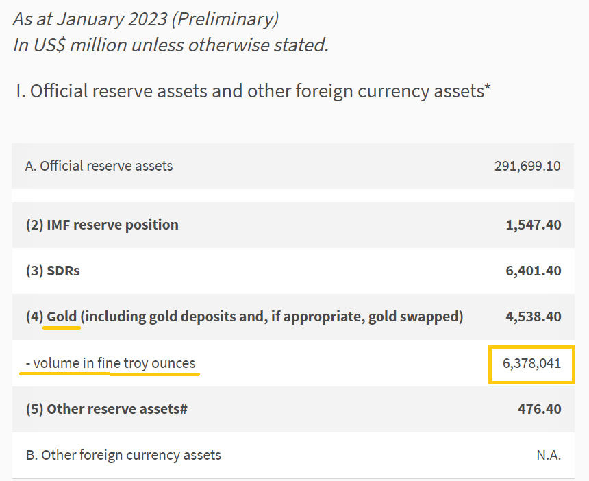 Ein Blick auf die Fassung dieses Berichts vom Dezember 2022 zeigt, dass die Reserveaktiva "Gold (einschließlich Goldlagerstätten und gegebenenfalls getauschtes Gold)" im Dezember 2022 ein Volumen in Feinunzen von 4.943.441 Unzen aufwiesen. Als dann Ende Februar die Version des Berichts für Januar 2023 veröffentlicht wurde, wies dieser nun ein Volumen in Feinunzen für Gold von 6.378.041 Unzen aus. Das ist ein Anstieg um 1.434.600 Unzen bzw. 44,62 Tonnen. Und prozentual gesehen ist das ein Anstieg um 29,02%.