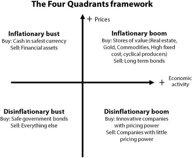 Dieser Chart verdient mehr Aufmerksamkeit. Er wurde 1978 von Charles Gave entworfen und verdeutlicht, wie man in den vier möglichen Kombinationen von Inflation/Deflation und Boom/Bust investieren kann. Damit diese Informationen nützlich sind, muss man natürlich zunächst wissen, in welchem Quadranten sich die Wirtschaft derzeit befindet oder in den sie eintreten wird. Leichter gesagt als getan. Aber wenn Sie sich erst einmal einen Ausblick verschafft haben, werden Sie wissen, was Sie damit anfangen sollen.