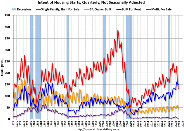 Bei den Baubeginnen gibt es eine interessante Veränderung. In diesem Chart wird die Gesamtzahl der neu gebauten Häuser nach Kategorien aufgeschlüsselt: zum Verkauf gebaute Einfamilienhäuser, Eigenheime, Mietwohnungen und zum Verkauf gebaute Mehrfamilienhäuser. Unten rechts ist zu sehen, dass die blaue Linie (zur Miete gebaut) gerade die rote Kategorie "zum Verkauf gebaut" überschritten hat - das erste Mal, dass dies seit Beginn der Datenreihe im Jahr 1975 geschehen ist. Das bedeutet, dass mehr neue Einfamilienhäuser mit der Absicht gebaut werden, sie zu vermieten, anstatt sie zu verkaufen.