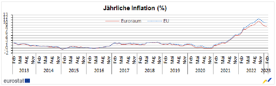 Die jährliche Inflationsrate im Euroraum lag im Februar 2023 bei 8,5%, gegenüber 8,6% im Januar. Ein Jahr zuvor hatte sie 5,9% betragen. Die jährliche Inflationsrate in der Europäischen Union lag im Februar 2023 bei 9,9%, gegenüber 10,0% im Januar. Ein Jahr zuvor hatte sie 6,2% betragen. Diese Daten werden von Eurostat, dem statistischen Amt der Europäischen Union, veröffentlicht.