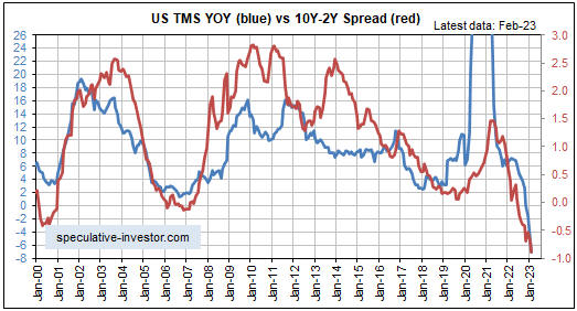 Es gibt einen guten Grund für die Annahme, dass der jüngste Aufschwung, der im obigen Chart dargestellt ist, nicht den Beginn eines neuen Trends markiert. Der Grund dafür ist die Beziehung zwischen der monetären Inflationsrate (blaue Linie) und der Renditespanne zwischen 10 und 2 Jahren (rote Linie), die im unten abgebildeten Chart dargestellt ist. Dieser Chart zeigt, dass die Renditespanne tendenziell der monetären Inflationsrate folgt und dass sich die monetäre Inflationsrate Ende Februar 2023 immer noch in einem Abwärtstrend befand.