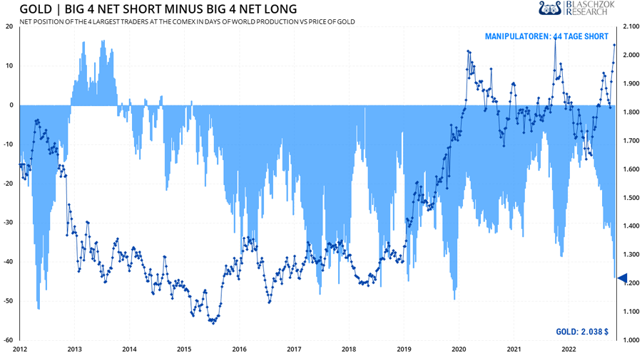 Bedenklich ist jedoch die hohe Shortposition bei den BIG4, die historisch hoch ist. Mit Ausnahme dem Jahr vor Corona, war eine hohe Shortposition bei den BIG4 immer ein verlässliches Zeichen für ein zyklisches Top am Goldmarkt. Die hohe Position der BIG4 sendet uns zumindest ein Warnsignal, dass das Top dieses Anstiegs sehr nahe sein dürfte.