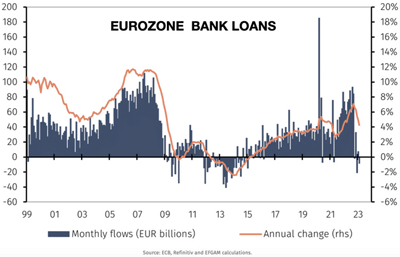 In Europa ist die Situation genauso verheerend. Die Eurozone-Banken fahren die Unternehmenskredite in einem Umfang zurück wie seit 2011 nicht mehr; sie gehen zudem davon aus, dass dieser Trend anhält.