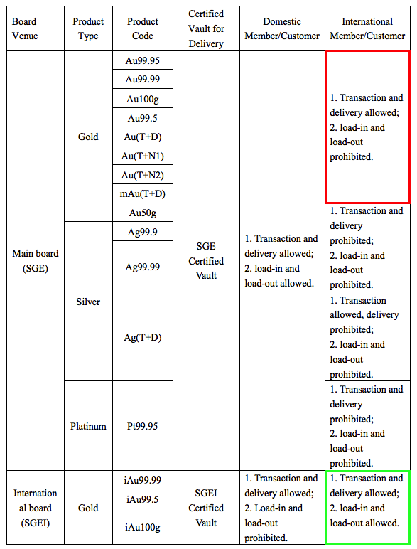 Die SGEI wurde 2014 eingerichtet, um Ausländern den Zugang zum Goldhandel am Main Board der Shanghai Gold Exchange auf dem chinesischen Inlandsmarkt und zum Handel am International Board in der Freihandelszone Shanghai (SFTZ) zu ermöglichen. Ausländische Unternehmen können kein Gold in zertifizierte Tresore am Main Board ein- und auslagern, aber sie können Gold in zertifizierte Tresore am International Board ein- und auslagern (und somit in die SFTZ einführen und aus ihr ausführen).