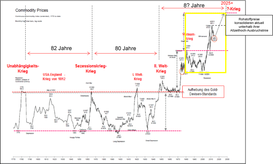 Abb. 1: Rohstoffpreisentwicklung in USD, inkl. signifikanter Kriegsereignisse von 1770 bis 2014