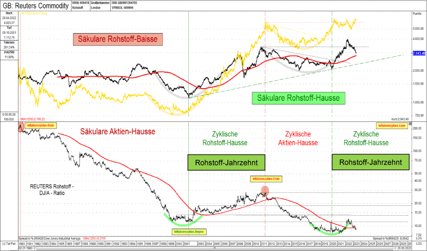 Abb. 2: CRB Reuters Rohstoff-Index in USD (schwarz) und Goldpreis in USD (gelb) versus CRB Reuters Rohstoff – DJIA – Ratio (unten) von 01/1980 bis 05/2023