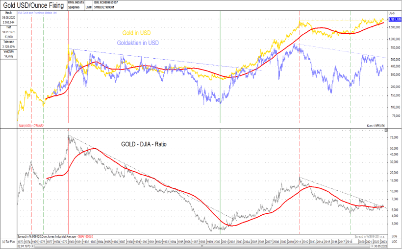 Abb. 3: Gold in USD (gelb) und ASA Goldaktien in USD (blau) versus GOLD – DJIA – Ratio (unten) von 01/1973 bis 05/2023