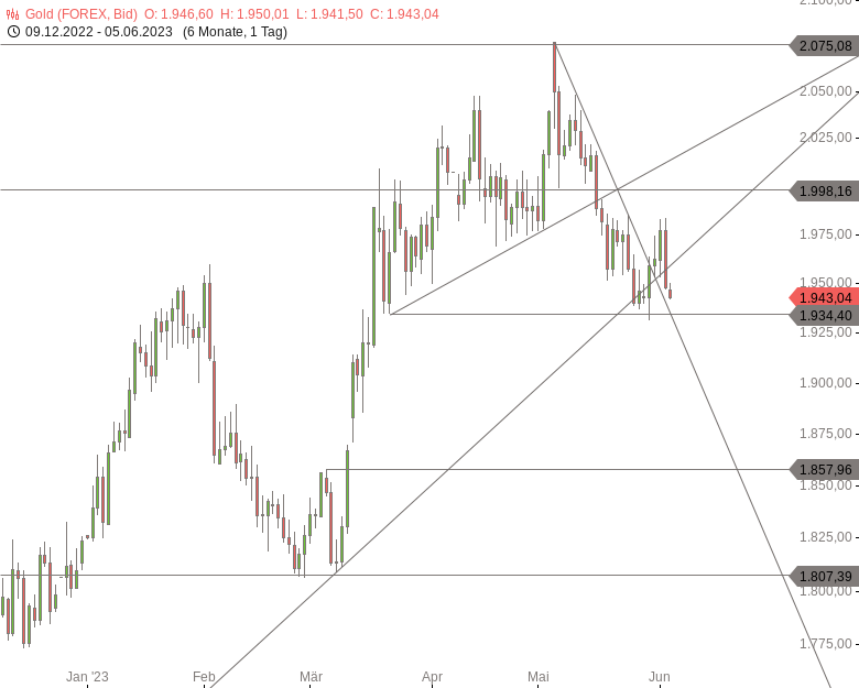 Sollten nach der erfolgten Gegenbewegung auch die 1.934 USD nicht gehalten werden, droht ein weiterer deutlicher Rutsch. Abgaben bis 1.858 USD könnten in diesem Fall folgen. Alternativ bietet sich aktuell noch die Chance, die Unterstützungszone zu bestätigen. Oberhalb der 2.000 USD wären die Bullen entsprechend wieder im Vorteil.