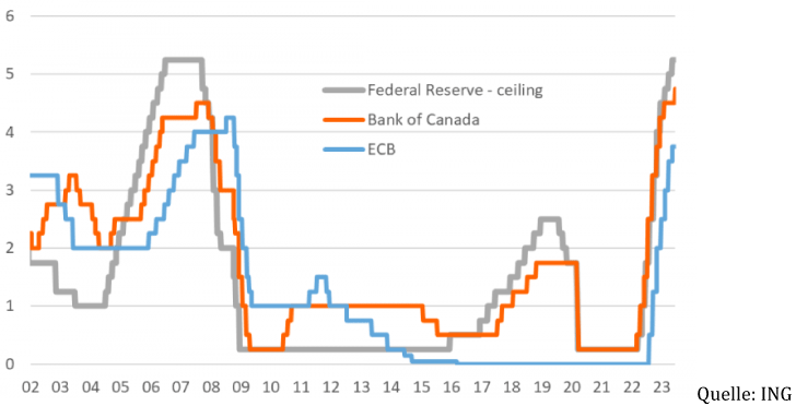 Derweilen wurde in Australien und in Kanada noch einmal an der Zinsschraube gedreht. Beide Länder haben in dieser Woche den Leitzins um 0,25% erhöht. In Kanada liegt der Leitzins nun auf einem 22-Jahreshoch bei 4,75% und in Australien bei 4,35%.