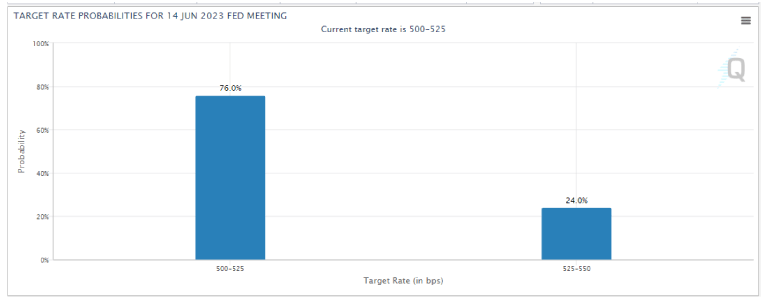 Per gestern rechnen weiterhin 76% damit, dass die FED kommenden Mittwoch eine Pause einlegen wird: