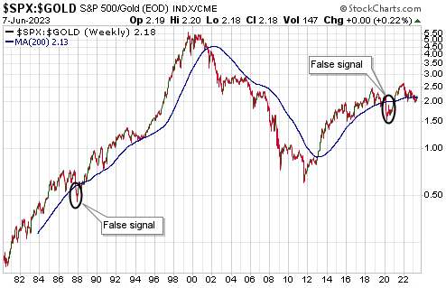 Der folgende Wochenchart zeigt, dass das SPX/Gold-Verhältnis im Verhältnis zu seinem 200-wöchigen gleitenden Durchschnitt (die blaue Linie) seit 1980 nur zwei Fehlsignale erzeugt hat. Beide Fehlsignale waren das Ergebnis von Börsencrashs - dem Oktober-1987-Crash und dem März-2020-Crash. Der Chart zeigt auch, dass das SPX/Gold-Verhältnis seit seinem Höchststand Ende 2021 auf seinen 200-wöchigen gleitenden Durchschnitt zurückgefallen ist, aber noch keinen nachhaltigen Durchbruch nach unten geschafft hat.