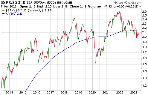 Seit mindestens einem Jahrzehnt beobachten wir das SPX/Gold-Verhältnis (oder das Gold/SPX-Verhältnis) im Verhältnis zu seinem 200-wöchigen gleitenden Durchschnitt, um festzustellen, ob sich Gold oder der SPX in einem langfristigen Bullenmarkt befindet. Wenn das SPX/Gold-Ratio über seinem 200-wöchigen gleitenden Durchschnitt liegt, bedeutet dies, dass sich der SPX in einem Bullenmarkt befindet und Gold nicht. Liegt das Verhältnis unter diesem gleitenden Durchschnitt, bedeutet dies, dass sich Gold in einem Bullenmarkt befindet und der SPX nicht.