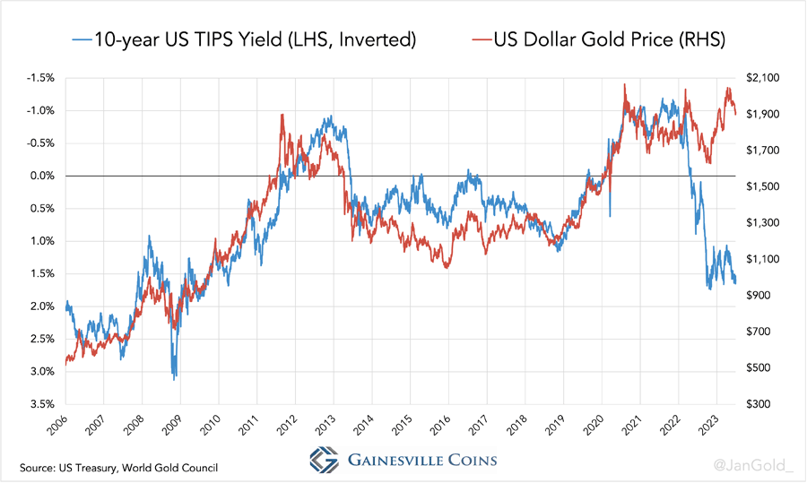 Der wichtigste Einflussfaktor für den Goldpreis in US-Dollar ist die 10-jährige Rendite der inflationsgeschützten Staatsanleihen (TIPS). Etwa 15 Jahre lang waren Gold und TIPS eng umgekehrt korreliert. Da die Besitzer von TIPS für die Inflation entschädigt werden, kann die TIPS-Rendite als der erwartete Realzins angesehen werden. Sie wird auch als "Realzins" bezeichnet. Die Logik hinter dieser Korrelation ist, dass Gold als Absicherung für US-Staatsanleihen (Treasuries) dient, da Gold kein Gegenparteirisiko hat. Der Goldpreis steigt also, wenn die TIPS-Rendite fällt und umgekehrt. Die Formel für die TIPS-Rendite lautet: