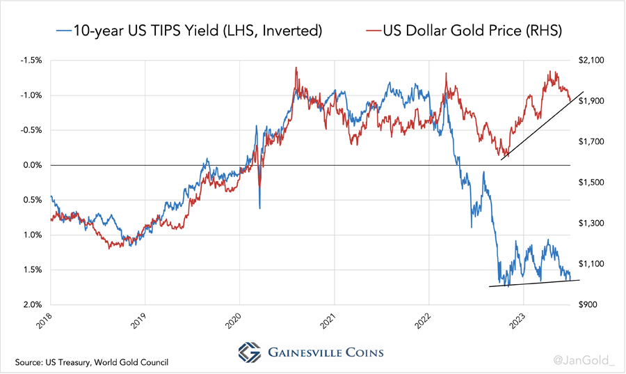 Im nachstehenden Chart können Sie sehen, dass die Korrelation zwischen dem Goldpreis und der TIPS-Rendite Anfang 2022, als Russland die Ukraine stürmte, zu schwächeln begann. Als die TIPS-Rendite von -1% im Februar auf +1,7% im November 2022 anstieg, sank der Goldpreis von 1.900 Dollar auf 1.700 Dollar, anstatt auf 1.000 Dollar, wie es das Modell zuvor vorgeschlagen hatte. Die enge Korrelation hatte sich nach oben verschoben, weil der Markt mehr Risiko beim Halten von Staatsanleihen anerkannte.