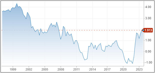 In früheren Kommentaren haben wir darauf hingewiesen, wie gut sich der Goldpreis in US-Dollar angesichts des Anstiegs der US-amerikanischen Realzinsen gehalten hat, wie die 10-jährige Rendite der inflationsgeschützten Staatsanleihen (TIPS) zeigt. Wir beziehen uns auf die Tatsache, dass die 10-jährige TIPS-Rendite, deren langfristiger Chart unten abgebildet ist, Anfang letzter Woche ein 14-Jahres-Hoch von 2,00% erreichte, bevor sie etwas zurückging, während der Goldpreis in US-Dollar weniger als die Hälfte seiner Aufwärtsbewegung von seinem Tief im vierten Quartal 2022 zurückgenommen hat. Wir sagen oft, dass alles miteinander zusammenhängt, und in diesem Fall ist der wahrscheinliche Zusammenhang (die Erklärung für die Widerstandsfähigkeit von Gold) die Art des jüngsten Ausverkaufs von Staatsanleihen.