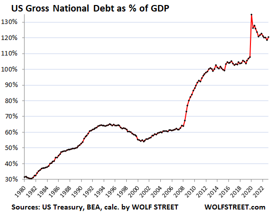 Die Schuldenquote der USA ist leicht auf 122,8% gestiegen. Dieser Wert basiert auf der (nicht inflationsbereinigten) Bruttostaatsverschuldung am Ende des zweiten Quartals geteilt durch das revidierte nominale BIP (saisonbereinigte Jahresrate, nicht inflationsbereinigt), das heute vom BEA veröffentlicht wurde. Der Anstieg auf über 130% war darauf zurückzuführen, dass das BIP gesunken und die Verschuldung in die Höhe geschnellt war. Wirtschaftswachstum und Inflation erhöhen das nominale BIP, und die Schulden wachsen mit den Defiziten.