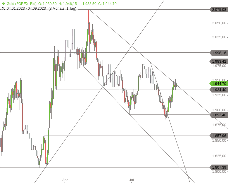 Der Kursverlauf hat innerhalb der Erholung den mittelfristigen Abwärtstrend knapp durchbrochen. Dies bietet die Chance, die Rally auch weiter in Richtung der 1.983 USD auszudehnen. Erst ein klarer Bruch dieser Hürde würde auch mittelfristig ein Kaufsignal andeuten. Ein Fehlausbruch aus dem Abwärtstrend kann aktuell noch nicht ausgeschlossen werden.