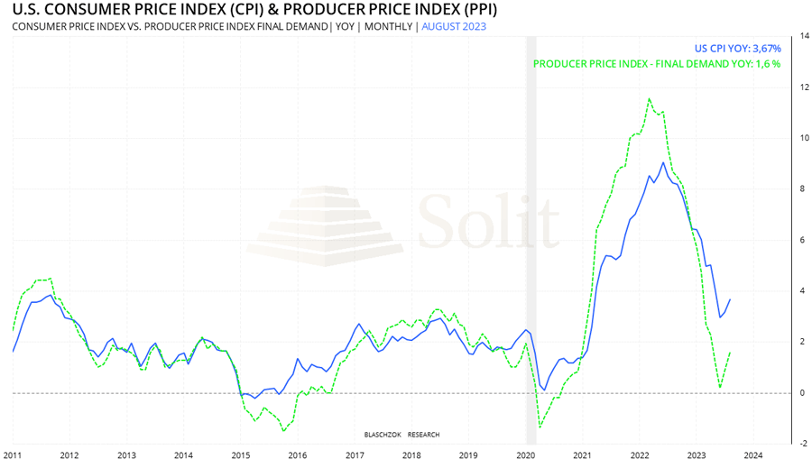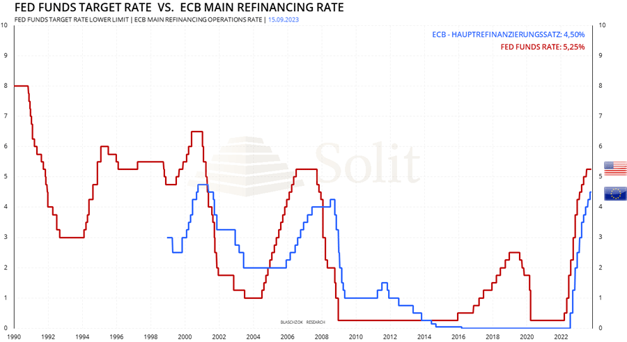 Die EZB strebt vermeintlich eine Geldentwertung von zwei Prozent an, wobei die aktuelle Inflationsrate in der Eurozone noch bei 5,3 Prozent liegt. Die Konjunktur in der Eurozone hat in der ersten Jahreshälfte weitgehend stagniert und auch für das dritte Quartal wird eine schwache Wirtschaftsentwicklung erwartet. Für Unternehmen bedeuteten die gestiegenen Zinsen höhere Finanzierungskosten, was sich negativ auf ihre Investitionstätigkeit und damit auch auf die konjunkturelle Entwicklung auswirkt. Eine Rezession scheint nach diesem historischen Zinsanstieg unausweichlich zu sein.