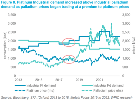 Da Palladium derzeit mit einem Aufschlag von mehr als 300 $ gegenüber Platin gehandelt wird und der Anteil des russischen Palladiums an der weltweiten Produktion bei 42% liegt, ist es nicht überraschend, daß Platin die industrielle Nachfrage nach Palladium gedämpft hat, da verschiedene Länder ebenfalls versucht haben, sich von Rußland abzukoppeln.