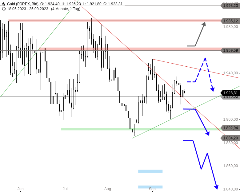 Sollte Gold in dieser Woche unter die Unterstützungszone von 1.915 bis 1.920 USD fallen, könnte der Kurs rasch weiter nach Süden drehen und an die Tiefs der Monate Juni und August einbrechen. Nur eine Verteidigung der 1.884-USD-Marke und ein direkter Anstieg über 1.940 USD könnte die Bullen dann noch vor einem weiteren Einbruch bewahren. Dieser würde bis 1.860 und 1.840 USD führen.