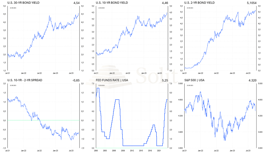 Den Leitzins beließ man unverändert in der Spanne von 5,25% bis 5,50%. Der sogenannte Dot-Plot, der die Einschätzungen der FOMC-Mitglieder visualisiert, zeigt nun eine Zinserwartung von durchschnittlich 5,1% im nächsten Jahr, während es bis dahin nur 4,6% waren. Die langfristigen Zinsen stiegen daraufhin weiter bis auf 4,5% an, dem höchsten Stand seit 16 Jahren!