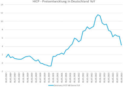 Die Inflation ist in Deutschland auf den niedrigsten Stand seit zwei Jahren gefallen, nachdem die Sondereffekte durch die zwischenzeitlich hoch subventionierten öffentlichen Verkehrsmitteltickets ausgelaufen sind. Die Verbraucherpreise stiegen im September um 4,3% gegenüber dem Vorjahr, im Vormonat lag der Wert noch bei 6,4%. Erwartet worden war ein Anstieg um 4,5%. Damit fiel die Inflation stärker als erwartet und liegt auf einem Niveau, auf dem sie bereits vor dem Ukrainekrieg lag.