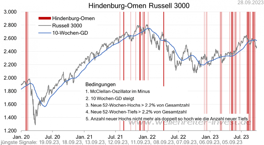 Der Russell-3000-Index bildet 99% der US-Marktkapitalisierung ab. Legt man die gleichen Bedingungen für ein Hindenburg-Omen wie an der NYSE an, dann traten seit Ende Juli eine Vielzahl an Russell-3000-Hindenburg-Omen auf, genauer gesagt waren es 21.