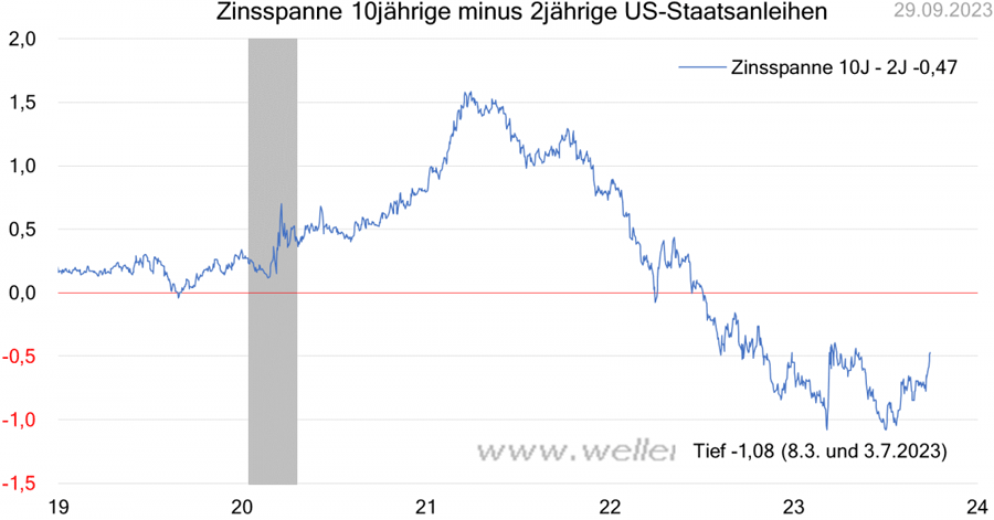 Allmählich scheinen sich einige Indikatoren zusammenzufügen. Der Beginn einer Rezession wird häufig von einer sich wieder verengenden Zinsspanne begleitet. Die Zinsen am langen Ende steigen, während das kurze Ende stabil ist oder bereits fällt. Wir sehen auf dem folgenden Chart ein Doppeltief der US-Zinsspanne 10 Jahre minus 2 Jahre (8. März und 3. Juli 2023).