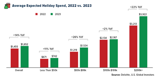 Werfen wir zunächst einen Blick auf die Aussichten für die Weihnachtsausgaben. Laut Deloitte's Holiday Retail Survey werden die Verbraucher in dieser Weihnachtssaison durchschnittlich 1.652 Dollar ausgeben, was einem Anstieg von 14% gegenüber dem Vorjahr entspricht. Diejenigen, die 200.000 Dollar oder mehr verdienen, planen, fast 4.000 Dollar auszugeben, gegenüber durchschnittlich 3.200 Dollar im letzten Jahr. Diese Zahlen stellen die Ausgaben vor der Pandemie in den Schatten und deuten auf eine Rückkehr zur Normalität hin.