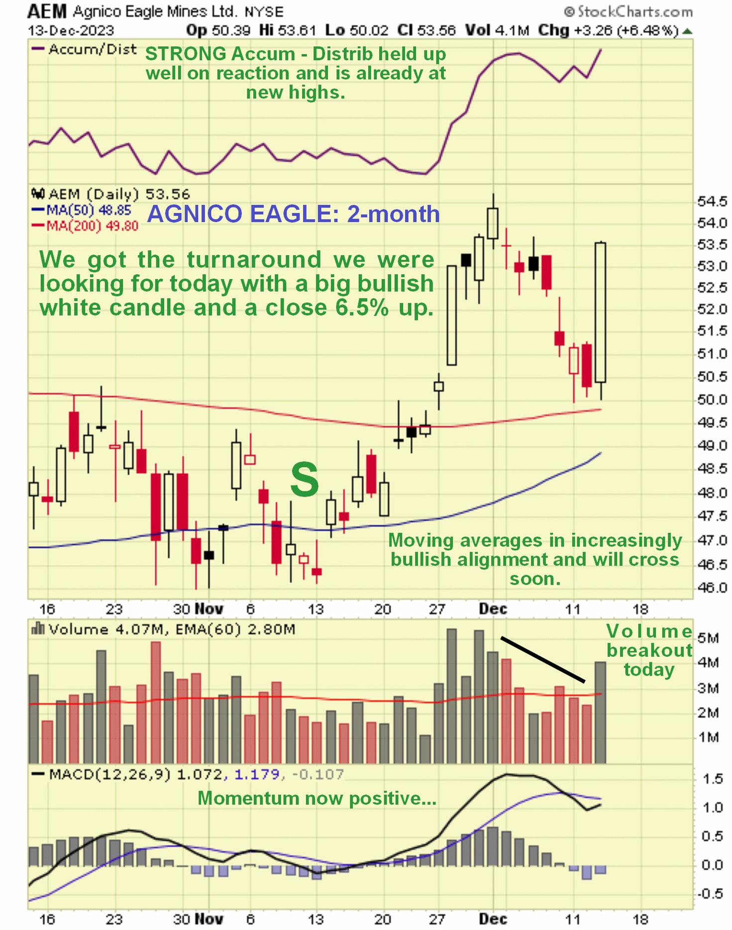 Der 2-Monatschart von Agnico Eagle, dem von uns beobachteten großen Leitindex des Goldsektors, zeigt das Ausmaß der Kursgewinne, die bei vielen anderen großen und mittelgroßen Gold- und Silberaktien ähnlich ausfallen.