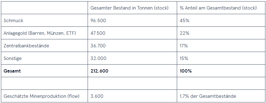 In den vergangenen Wochen erzielte Gold in vielen Währungen neue Allzeithochs, so im US-Dollar, im Euro oder auch im Schweizer Franken. Die euphorische Stimmung unter Goldanlegern wollen wir bewusst zum Anlass nehmen, uns einem fundamentalen Thema zu widmen. Denn unserer Auffassung nach herrscht im Goldsektor ein elementares Missverständnis vor. Ein Großteil der Marktteilnehmer und Analysten messen der jährlichen Produktion aber auch der jährlichen Nachfrage deutlich zu viel Bedeutung bei. So liest man häufig, dass der Goldpreis niemals unter die Produktionskosten fallen könne. Nachfolgend wollen auf diesen Irrtum eingehen.Jedes Gramm Gold, das aus unterschiedlichsten Motiven gehalten wird, ist zu einem bestimmten Preis verkäuflich. Manche Eigentümer würden bereits bei einem geringfügig über dem aktuellen Spot-Preis notierenden Preis verkaufen, viele erst in deutlich höheren Preis-Sphären. Wenn eine Privatperson – in Folge stark gestiegener Preise – seine vor Jahrzehnten gekauften Goldbestände veräußern will, verringert dies aber klarerweise nicht den Gesamtbestand von Gold. Es findet lediglich eine Verlagerung von einem Privatbestand zu einem anderen Privatbestand statt. Für den Käufer ist es völlig egal, ob das Gold vor drei Wochen oder drei Jahrtausenden gefördert wurde.
