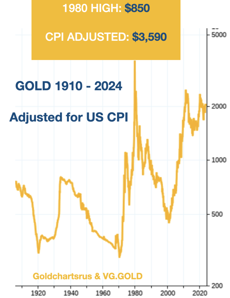 Also: Inflationsbereinigt läge das Gold-Hoch von 1980, das damals bei 850 US$ markiert wurde, heute bei 3.590 US$. Wenn der Goldpreis aber um die TATSÄCHLICHE Inflation bereinigt wird – auf Grundlage der Berechnungen von Shadow Government Statistics – dann würde jenes 850 US$-Hoch bei heutigen 29.200 US$ liegen.