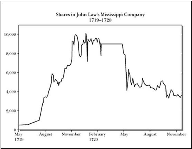 Schließlich entwarf Law einen Plan zur Umstrukturierung des größten Teils der Staatsschulden durch den Tausch von Staatsschulden gegen Aktien der Compagnie. Die Aktien der Compagnie wurden der Öffentlichkeit 1719 zu einem Preis von 500 Livres angeboten. Bald entwickelte sich eine Manie, und der Aktienkurs stieg bis zum Jahresende um 1.900% auf 10.000 Livres, ein Preis, der weit über dem tatsächlichen Wert des Unternehmens lag. Alle wurden reich, Adlige und einfache Leute gleichermaßen.