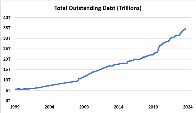 Am 26. März 2024 überschritt die Staatsverschuldung die Marke von 34,6 Billionen Dollar. Seit Beginn des neuen Jahrhunderts ist die US-Verschuldung von 5 Billionen Dollar auf heute 34,6 Billionen Dollar gestiegen und wächst alle 120 Tage um 1 Billion Dollar. Wie die Kriege Ludwigs XIV. waren die USA im letzten halben Jahrhundert in ständige Kriege verwickelt, von Korea, Vietnam und dem ersten Golfkrieg bis zum zweiten Golfkrieg dieses Jahrhunderts, dem Krieg gegen den Terrorismus und den Stellvertreterkriegen in Afghanistan, der Ukraine und im Nahen Osten.